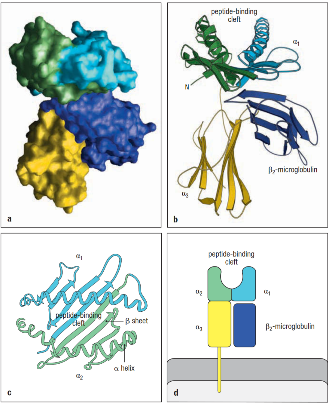 Composed of two polypeptide chains α and β2-microglobulin. Only the α chain spans the membrane in class 1. α3 and β2 resemble Ig-like domains in their structure.