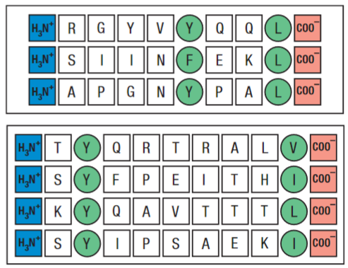 Peptides lacking carboxy and amino terminal groups fail to bind stably. Other residues act as anchors, and these interactions vary depending on the MHC allotype. MHC class I binding peptides are usually 8-10 amino acids long, and if longer peptides bind they are normally cleaved by exopeptidases in the ER.