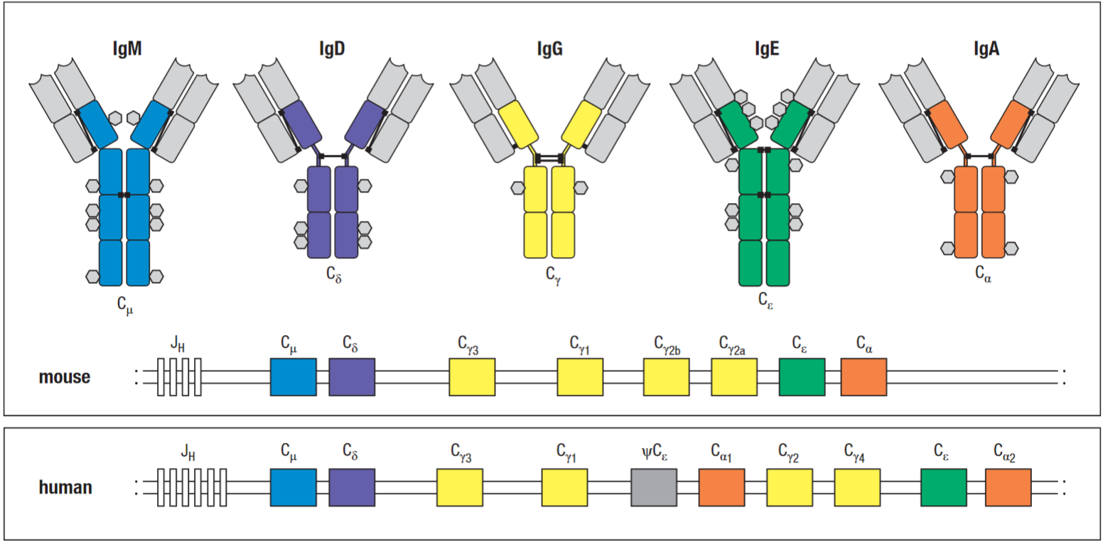 The light chain C regions provide only structural attachment for V regions. Heavy chain locus encodes different C regions (CH) that are present as separate genes located downstream of the V region segments. Initially, naïve b-cells use only the first two of these, the Cμ and Cδ genes, which are expressed along with the associated assembled V-region sequence to produce transmembrane IgM and IgD on the surface of the naïve b-cell.