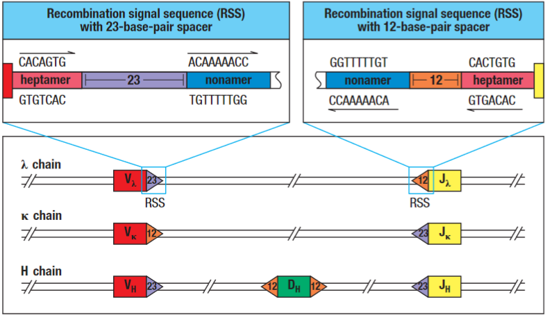A gene segment flanked by an RSS with a 12-bp spacer typically can be joined only to one flanked by a 23-bp spacer RSS. This is known as the 12/23 rule. V and J domains on the λ chain have the inverse spacer orientation to κ to prevent cross binding. Additionally Vh and Jh cannot be joined directly without the Dh gene segment due to the 23 bp spacers on each of them.